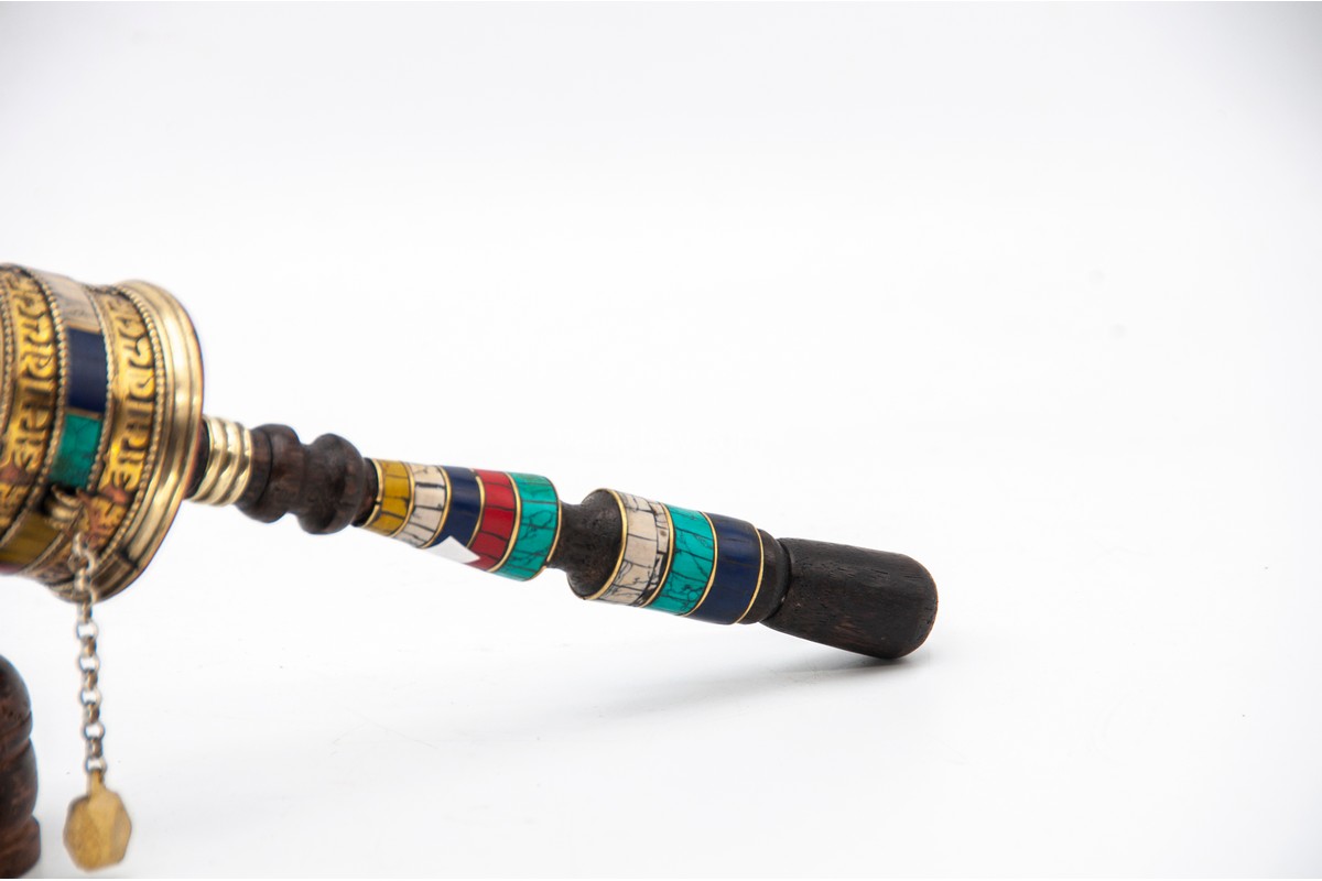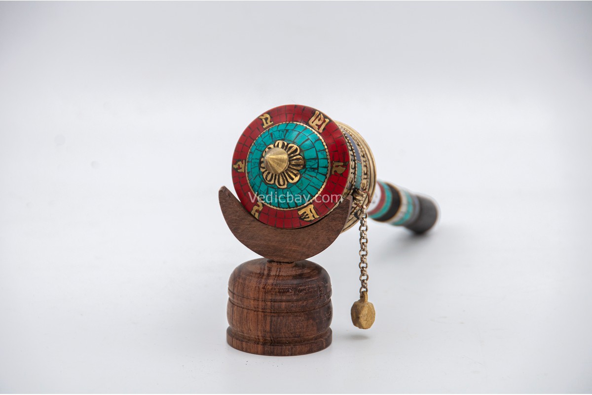 Both the prayer wheel and the wooden handle are meticulously decorated with colorful semi-precious stones, making it not only a spiritual object but also a stunning piece of art. Inside, a long roll of sacred Tibetan mantras is securely sealed. A solid brass bob on a short chain aids in spinning the wheel smoothly as it releases spiritual energy with each rotation.