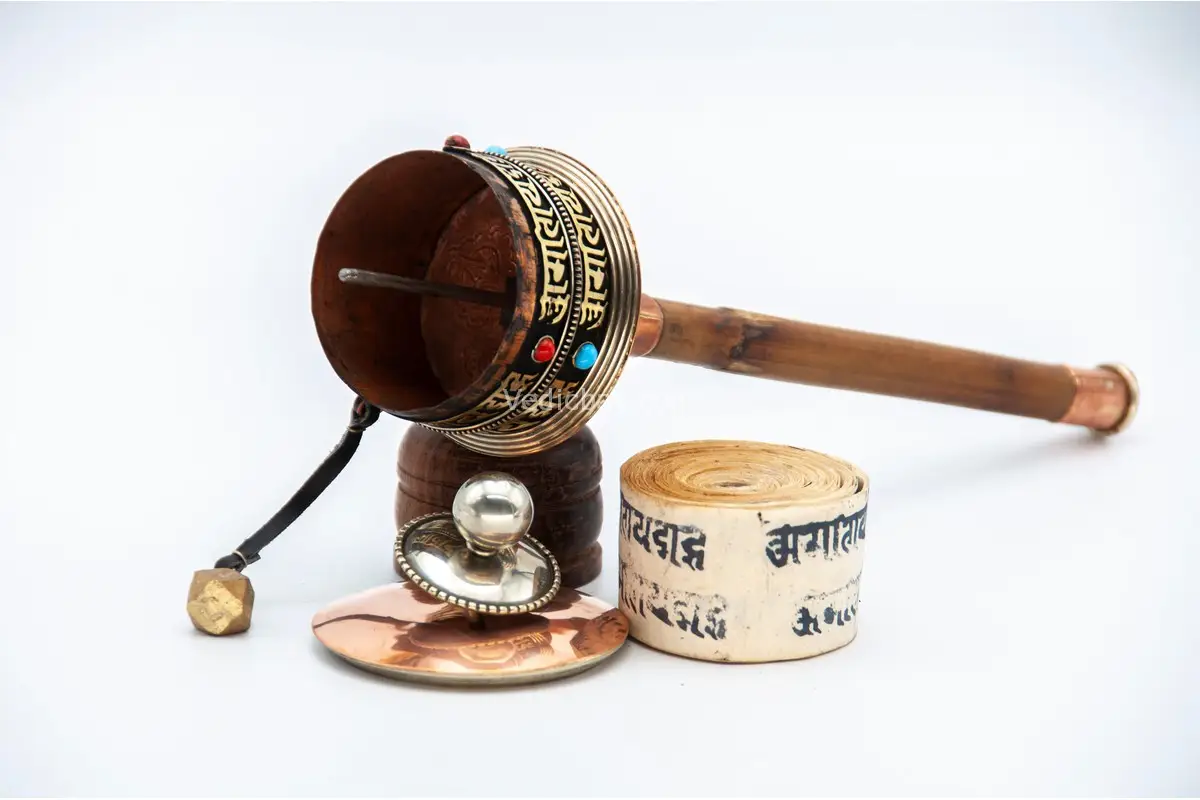 Mounted on a natural cane bamboo handle, the wheel spins effortlessly when turned clockwise. Inside the hollow cylinder lies a long roll of sacred mantras, activated with every rotation to spread spiritual blessings. A brass bob, attached with a chain, helps maintain the momentum as the wheel turns.