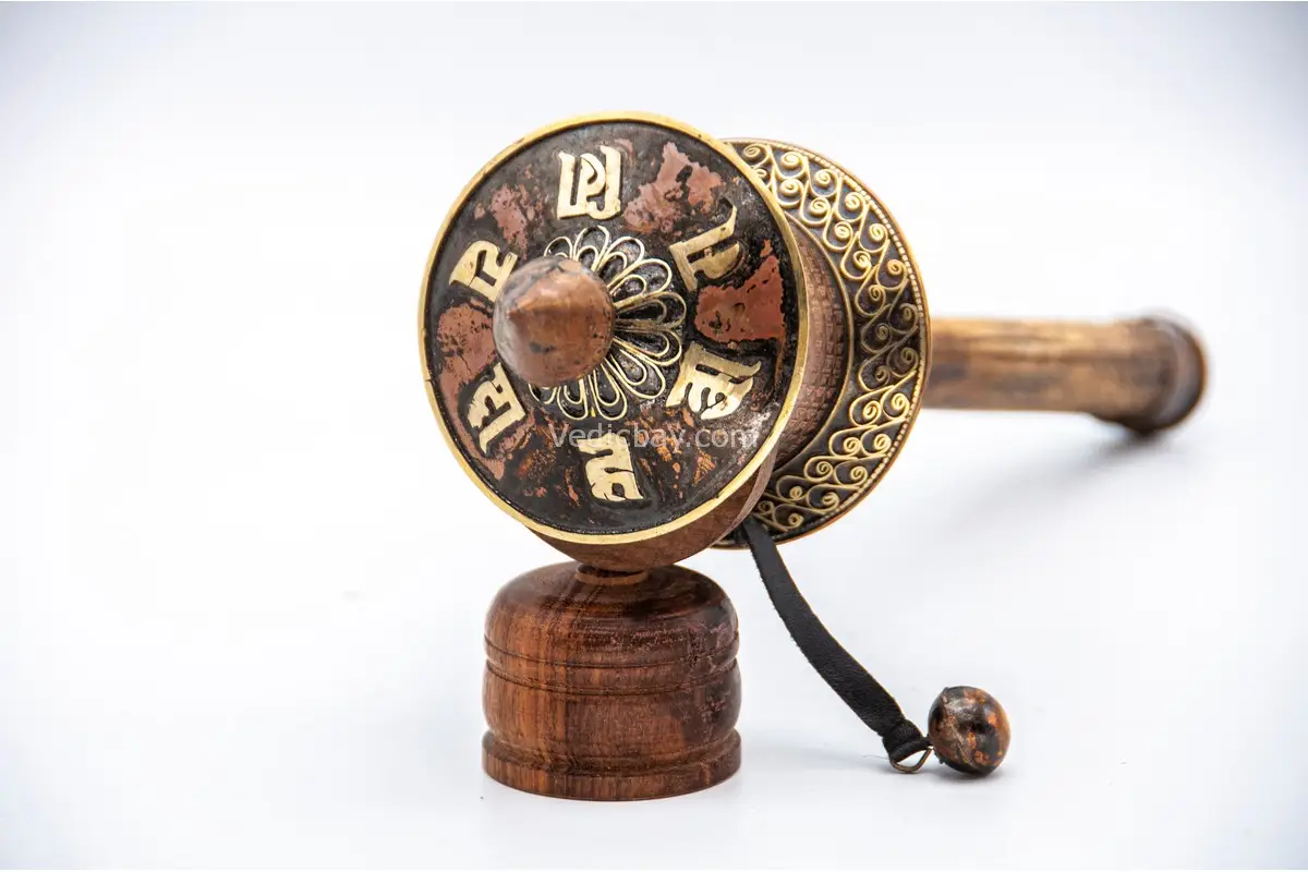 A brass bob hangs from the side of the wheel by a chain, helping it rotate smoothly during your practice. This piece blends artistry with sacred tradition, making it ideal for personal devotion, altar displays, or spiritual gifting.