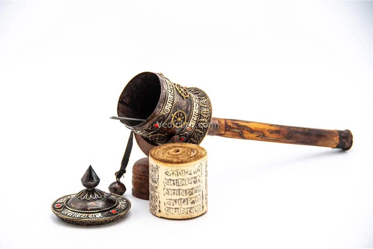 The wheel includes a long mantra scroll rolled inside the hollow cylinder. You can open the top spire and lid to view the printed sacred mantras inside. Attached to the wheel is a solid brass bob, connected by a short chain to assist in its rotation. The handle is carved from wood, offering a sturdy and traditional grip for use during ritual practices or meditative walks.