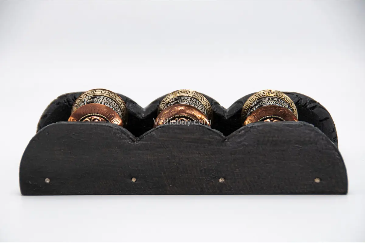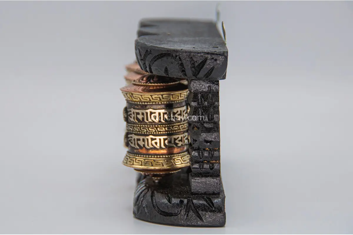 - Material: Brass prayer wheel with hand-carved wooden frame
