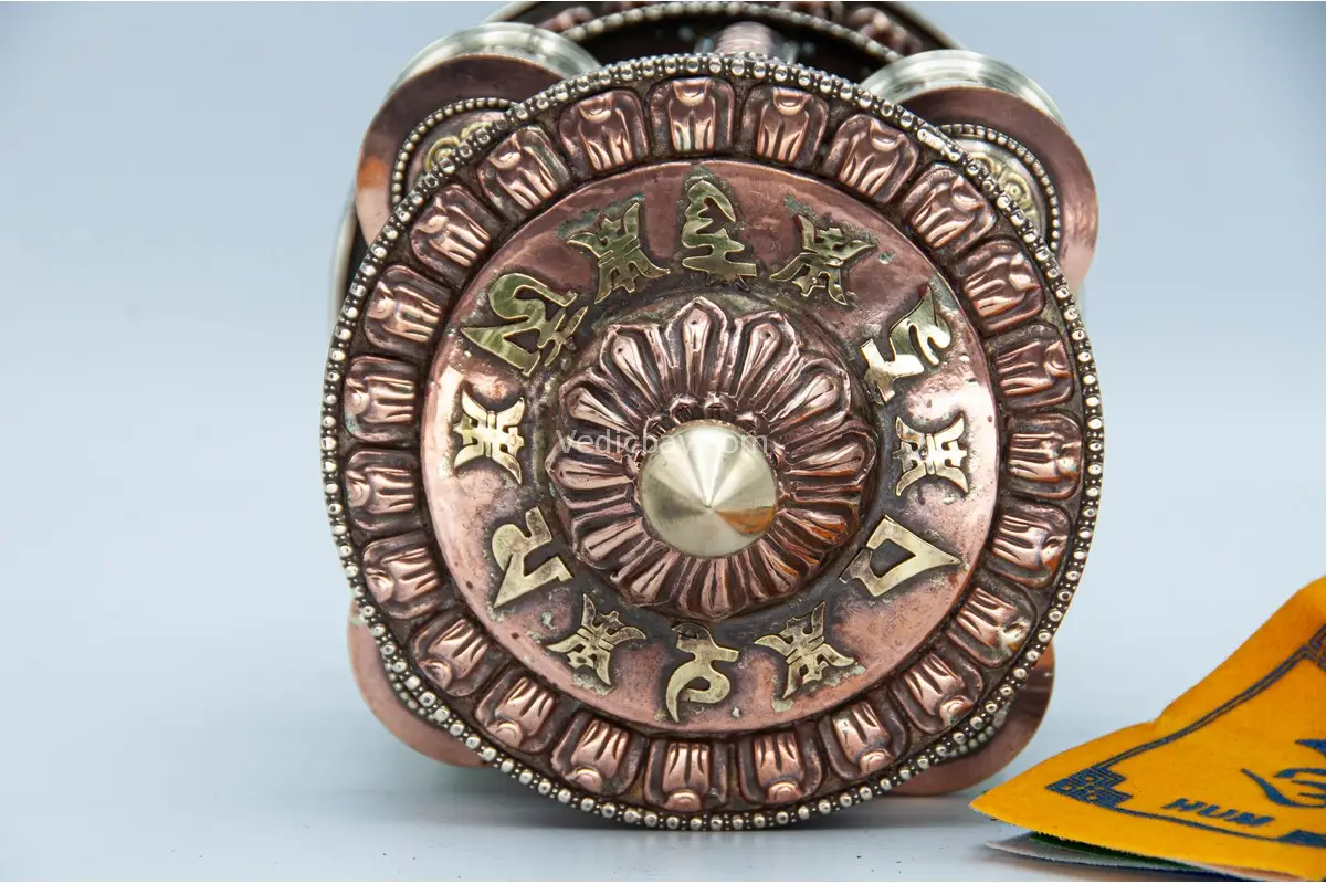 The round base is embossed with lotus petals, mantra designs, and the Eight Auspicious Symbols (Ashtamangala), all of which represent prosperity, wisdom, and balance. When spun clockwise, the wheels are believed to release healing energy and blessings into the environment. Additionally, its compact design and intricate craftsmanship make it perfect for altars or meditation spaces.