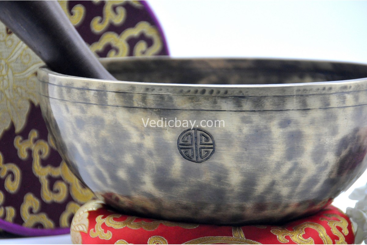 Large Foot Engraved Singing Bowl – Fire & Tibetan Mantra – Vajra Symbol