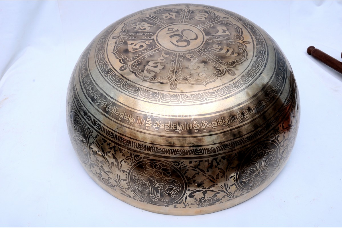 Large Foot Engraved Singing Bowl β Fire & Tibetan Mantra β Vajra Symbol