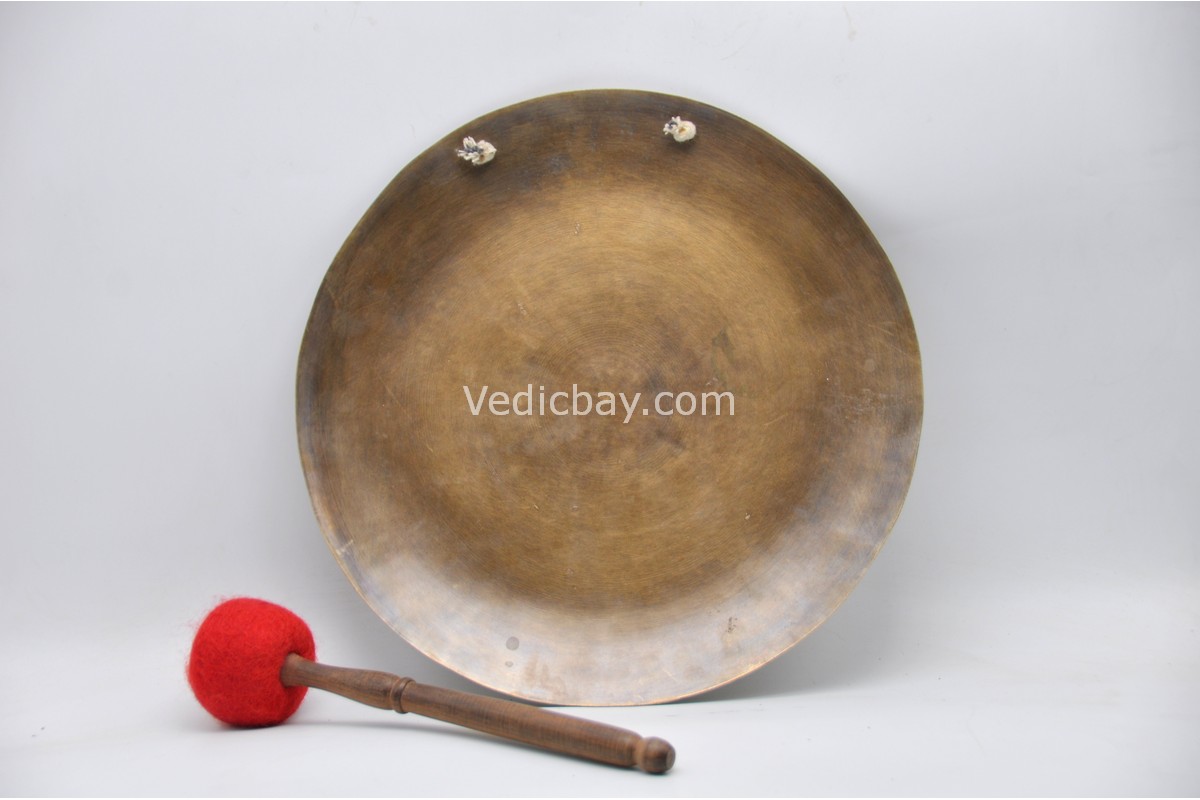 A gong is a circular metal disc that produces sound when struck. In Tibetan tradition, it is used for rituals, meditation, and calling monks to prayer. Its deep vibrations promote a shift in consciousness and help create spiritual presence in any space.