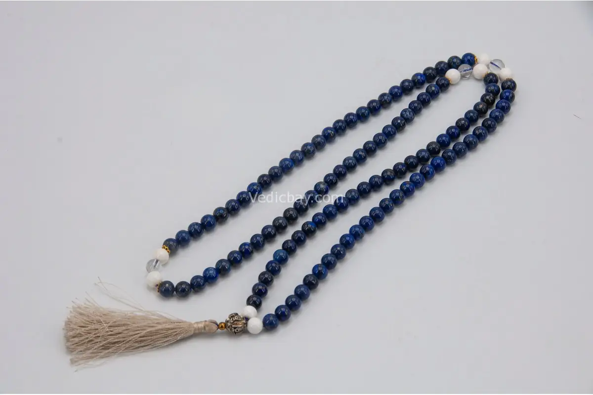 As natural materials, lapis lazuli, crystal, and conch shell may vary slightly in color and texture. These variations make each mala distinct and spiritually unique.