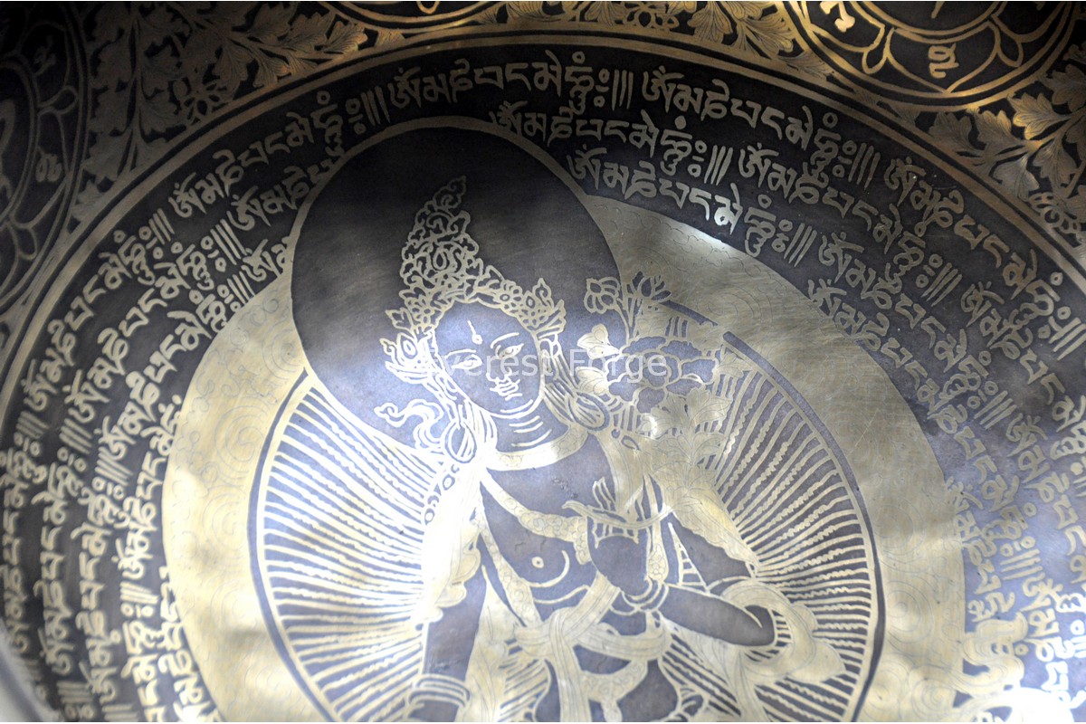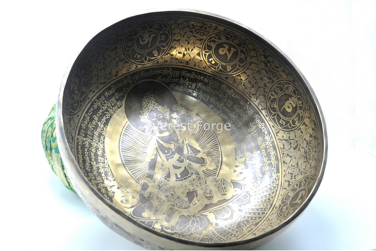 Large Green Tara Singing Bowl – Tibetan Mantras, Auspicious Symbols & Flower of Life