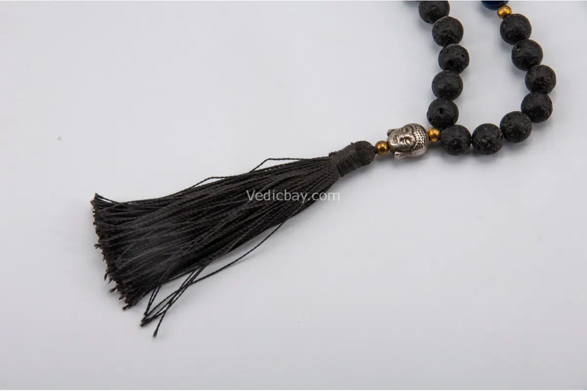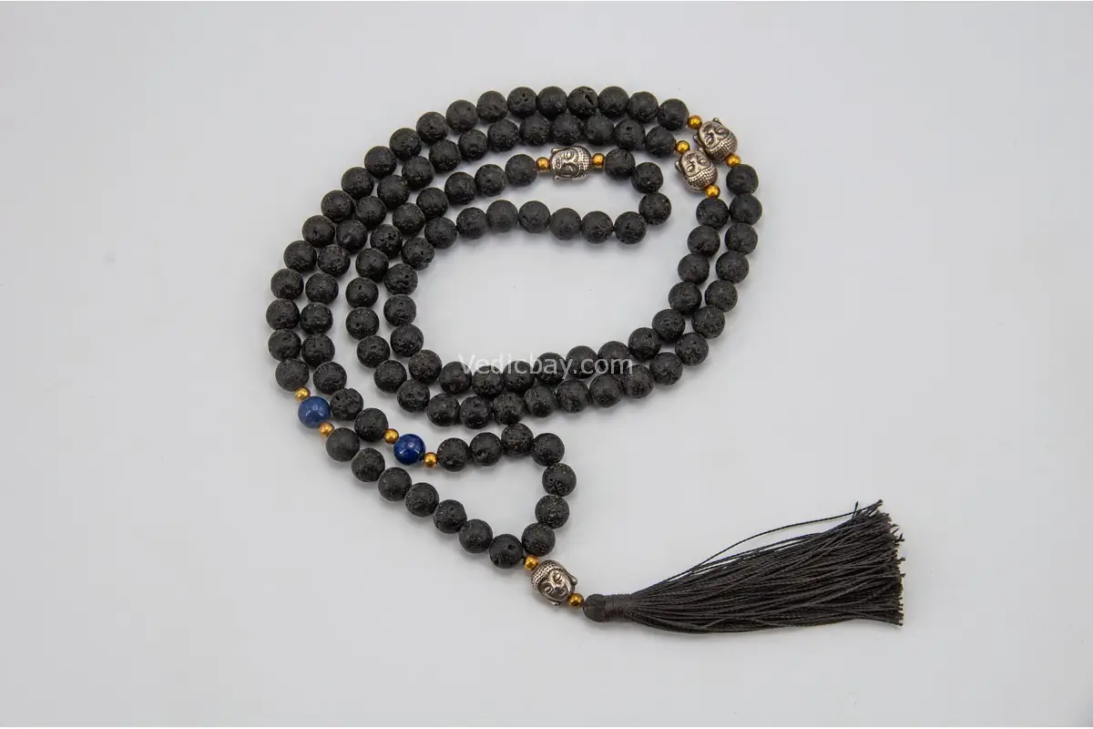 - Material: Natural black lava stone beads with metal or carved Buddha head guru bead