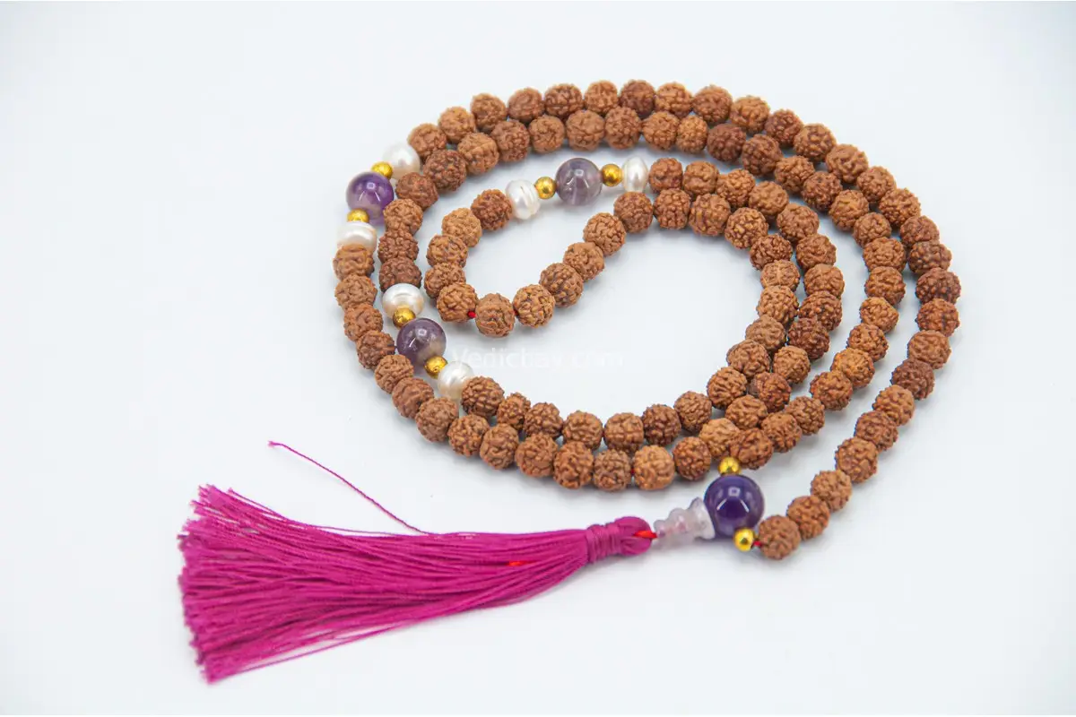 - Material: Natural Rudraksha seeds, freshwater pearls, and amethyst gemstones