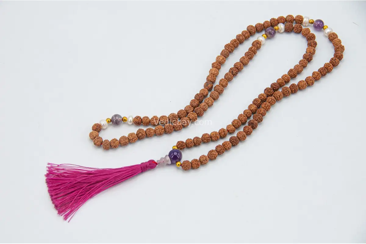 Enhance your spiritual journey with the grounding energy of Rudraksha, the calming purity of Pearl, and the intuitive clarity of Amethyst. This 108-bead Rudraksha Mala with Pearl and Amethyst blends three sacred elements to support meditation, healing, and emotional balance. Thoughtfully designed for heart-centered clarity, this mala invites deeper focus into your daily practice.