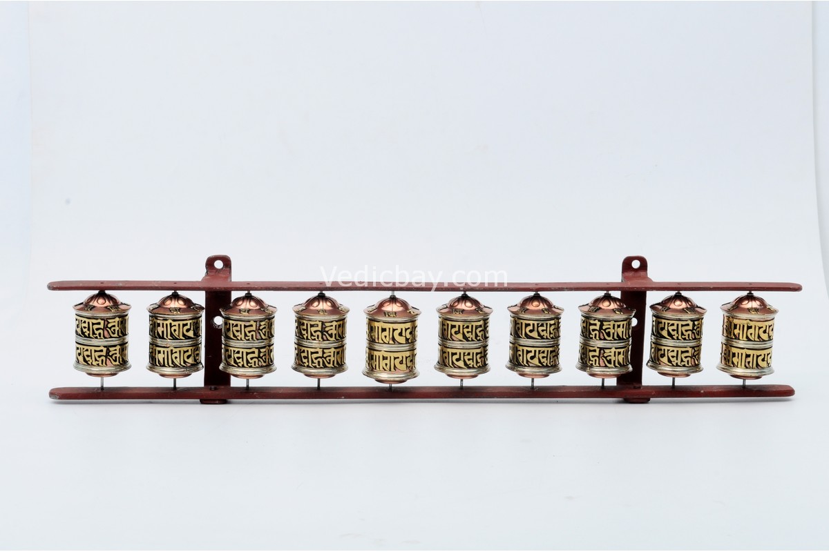 This 10-in-1 Tibetan Prayer Wheel set is a stunning devotional item designed to be either hung on the wall or placed on a flat surface. Each individual wheel is intricately handcrafted in Nepal and decorated with the sacred two-line Tibetan mantra “Om Mani Padme Hum” embossed in brass. The structure rests within a durable iron frame and is ideal for home altars, meditation rooms, or spiritual spaces.