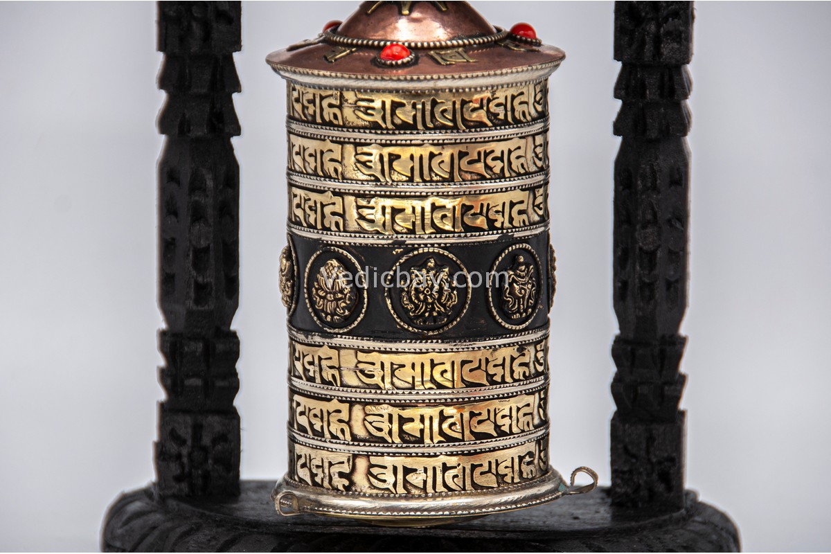 The wheel contains a rolled mantra scroll sealed inside. Each clockwise spin activates the prayers within, believed to release blessings and healing energy into the space. This traditional dharma wheel represents the continuous cycle of compassion and enlightenment in Tibetan Buddhism.