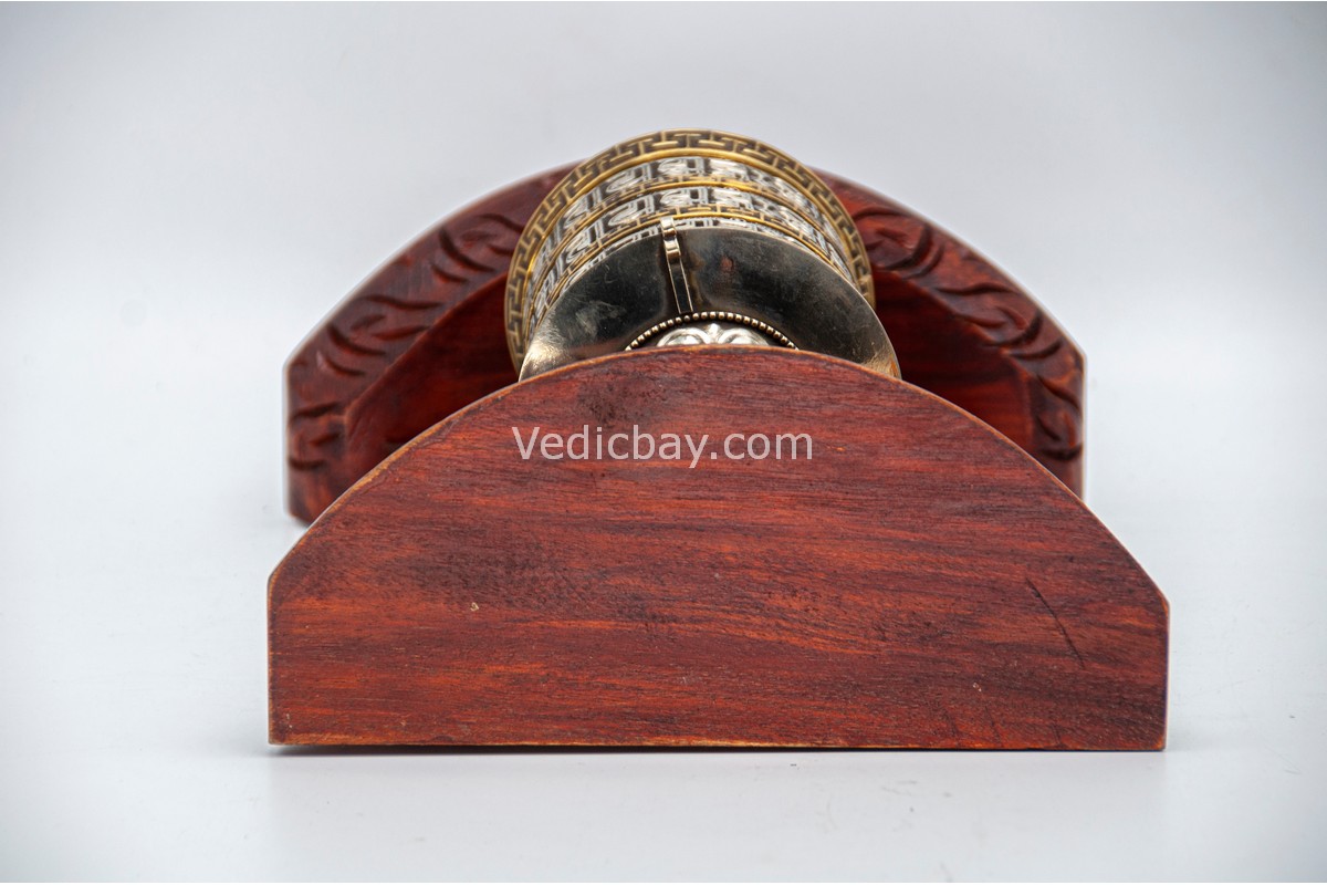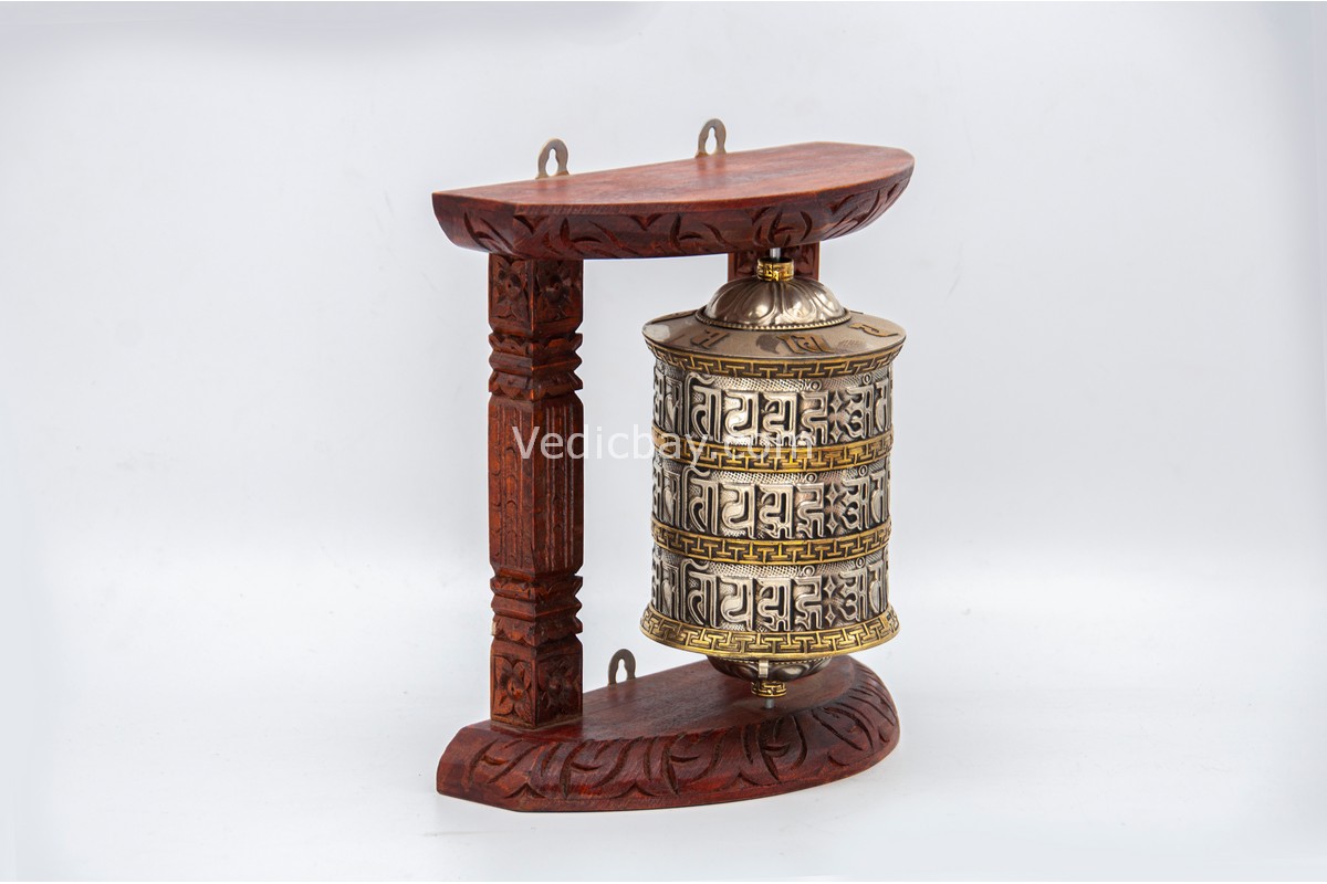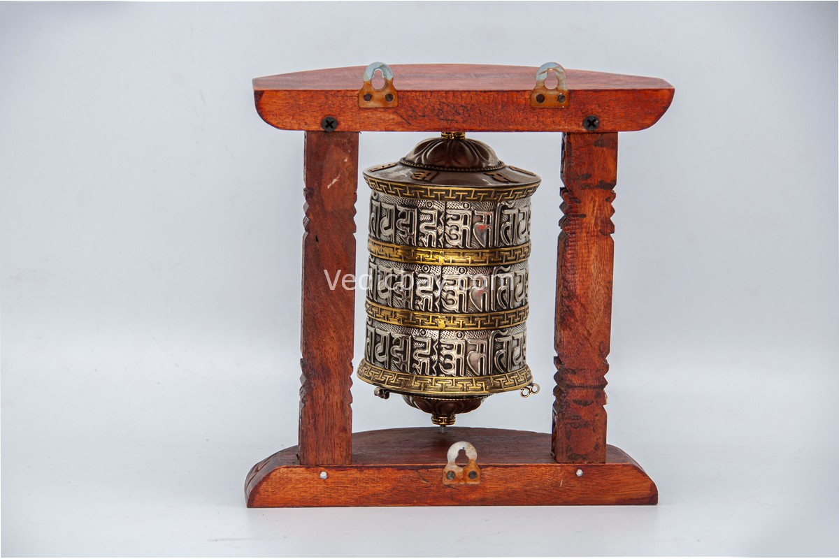 • Material: Copper Wheel, Brass Mantra, Silver-Tone Housing, Wooden Frame